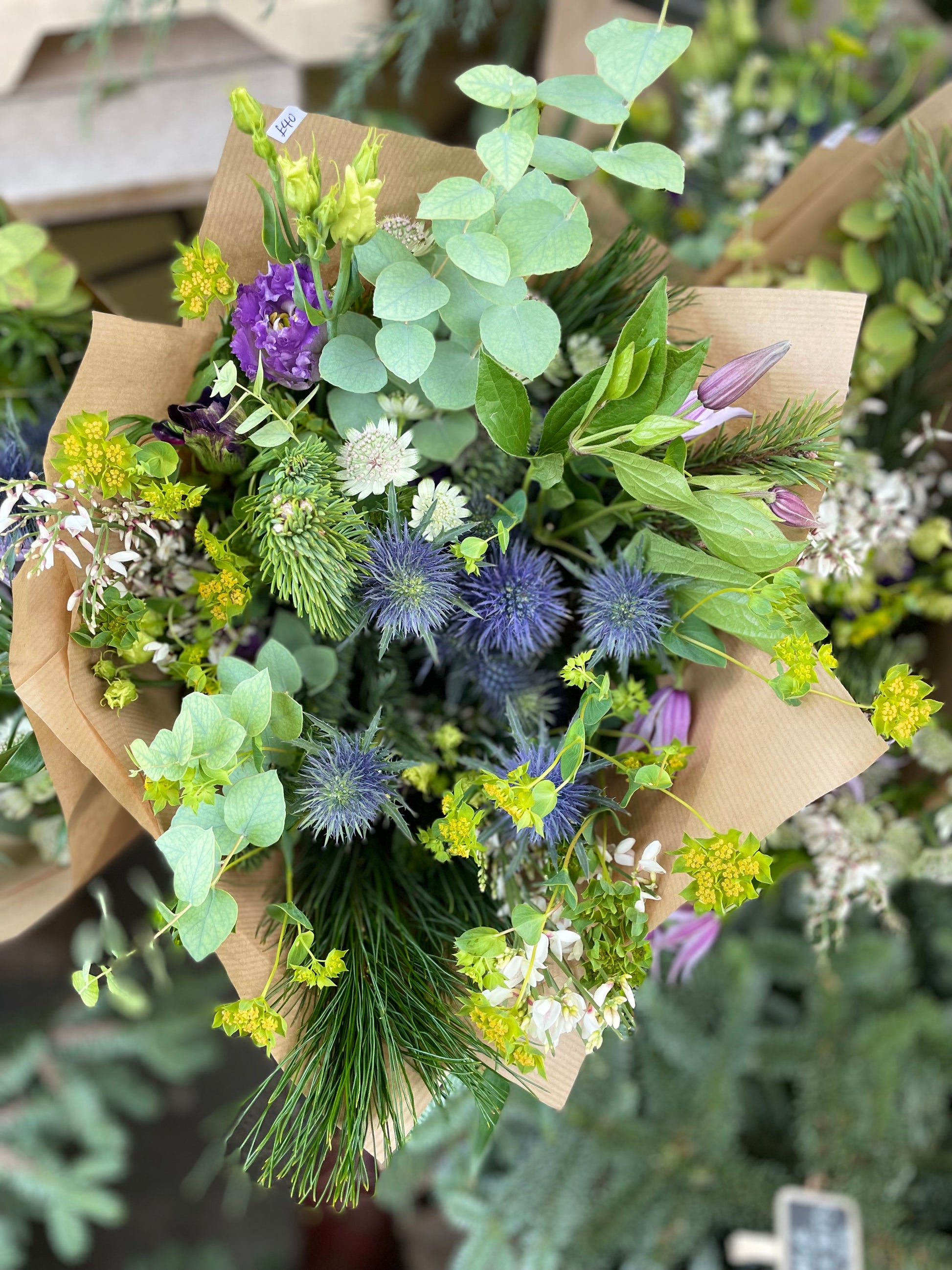 No traditional red berries, roses, amaryllis or sparkle here - this bouquet is all about rustic winter textures in a blue, green, purple and white colour way with Scottish thistles as a focal point.
